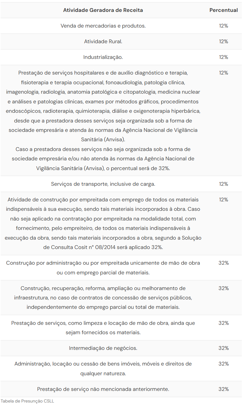 Os percentuais de presunção do CSLL a serem aplicados sobre a receita bruta (o que é faturado – nota fiscal) do trimestre são os seguintes: