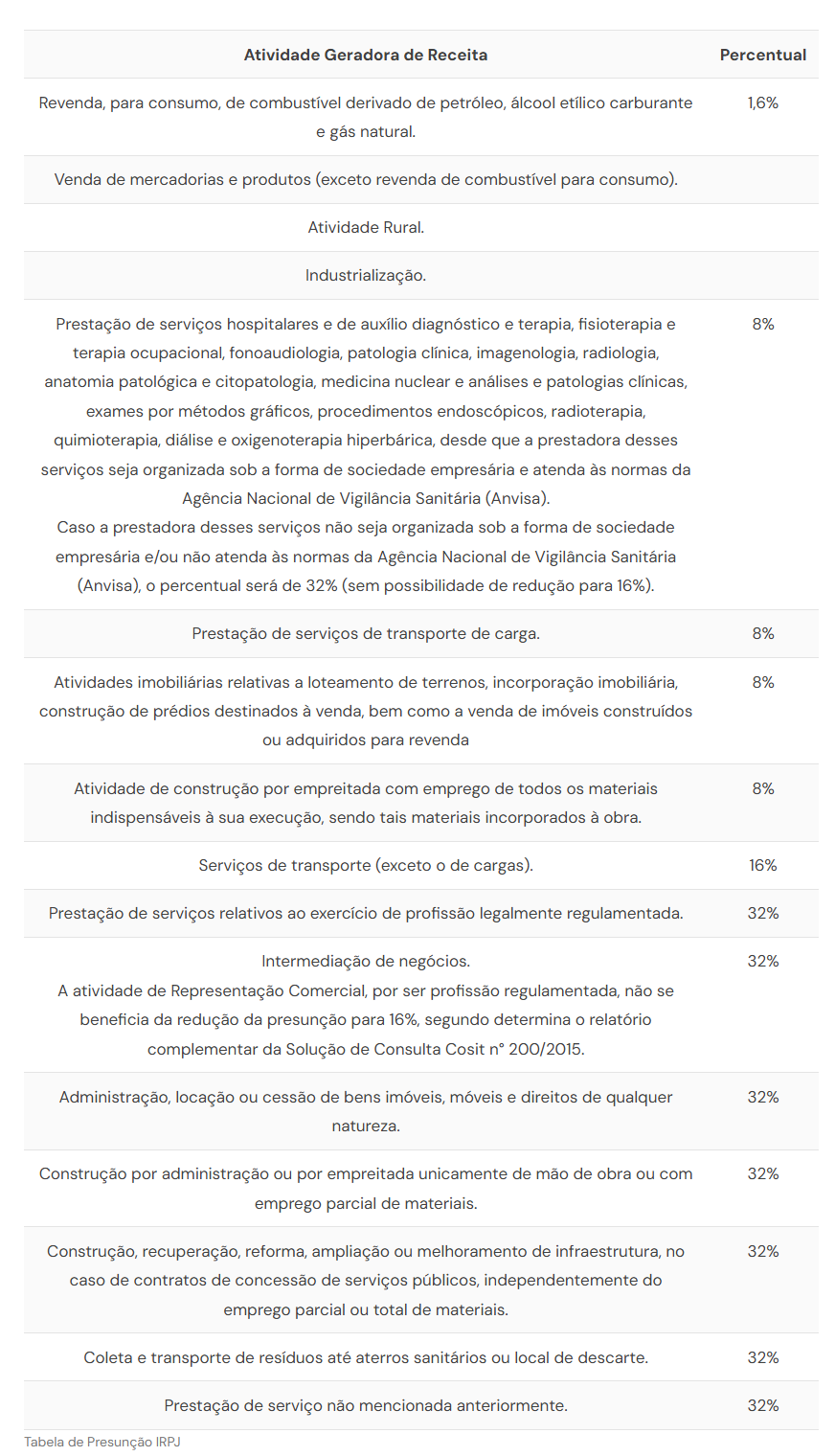 | Imposto de Renda da Pessoa Jurídica | 32% Tabela de Presunção e 15% para encontrarmos o IRPJ a pagar |